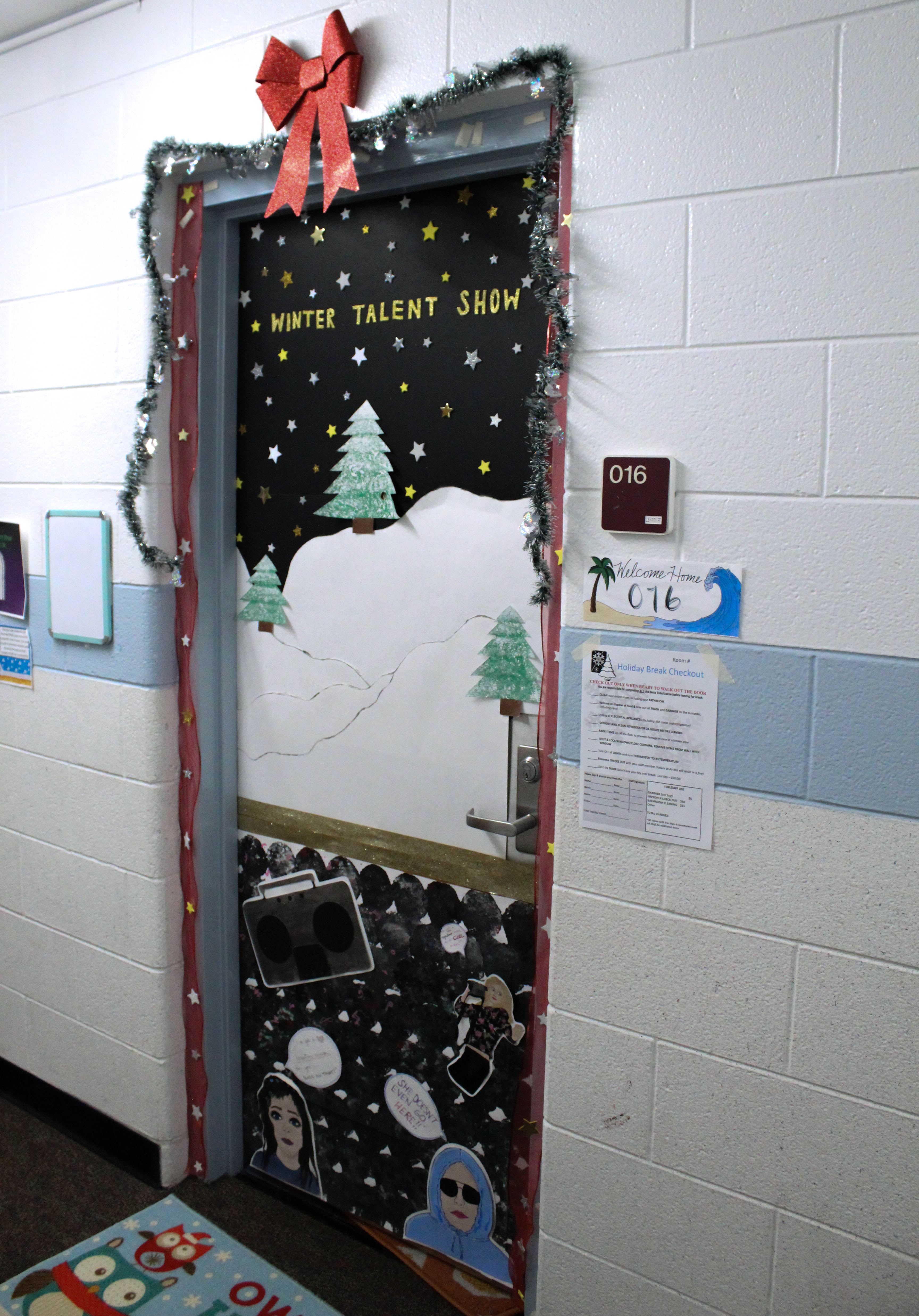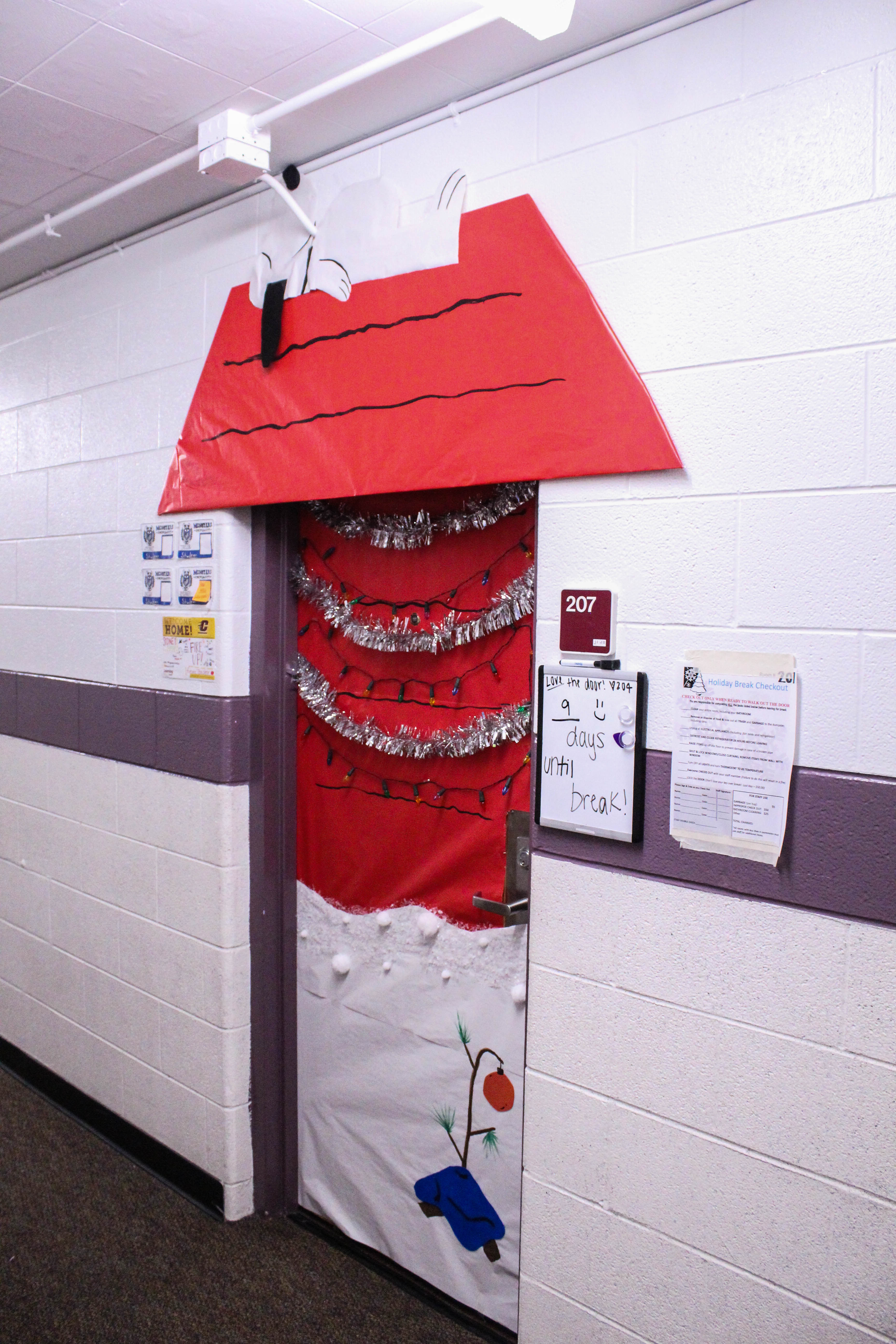 December 12, 2018 College Living, Student Lifestyle Deck the Dorms: Students Decorate Dorm Doors Photos and Story by Sydney Hutchison College students understand how the excitement of the holiday season is often overshadowed by the chaos that is final exams. On college campuses around this time of year, sometimes it’s hard to find the holiday spirit. Despite the stress of finals, many students in the dorms find time to spread their holiday cheer. Decorating your dorm is a fun and easy way to get in the holiday spirit and share it with your peers. Roommates freshman Paige Kopczyk, Sydney Eustice and Sydney Amsdill enjoy making time to decorate their dorm room. “If you look down our hallway, not many people decorate their doors,” said Eustice. “It’s fun for us to create ideas,” said Kopczyk. Many residents agreed that one of the main reasons they decorate their dorms is because they love the holiday season and want to share their joy with fellow residents. “Christmas is all of our favorite holidays in our room so we wanted to do something festive. Everyone walks past the door so we thought this would be a great place to put something,” said junior Vanessa Chambe. For some people, decorating their door is a way to de-stress during the busiest time of the semester. When asked why she decorates her door junior Abby Read said, “I think it’s kind of relaxing to do instead of homework. It’s a nice little break.” Door decorations are also a way to bring residents together. Sophomore Bailey Birman, a Resident Assistant in Herrig hall, thinks that the best part about the holidays in the dorms “is when everyone comes together and decorates and celebrates together.” Around this time of year, the sense of community in the dorms is stronger than ever. “Wherever you walk, there’s always christmas music being played and people are trying to do things to get into the holiday spirit,” Chambe said. Junior Isabella Gross agreed. “I like that generally people are in a good mood because Christmas is coming,” she said. “Everybody is ready to go home and see people but they’re also nice because they’re aware that everyone is missing their families.” During the holiday season being away from home can become especially difficult. According to sophomore Andrea Bell, “I feel like the decorations make it feel a little bit more at home. Even decorating inside your room or your door it makes you feel like you aren’t so far away.”