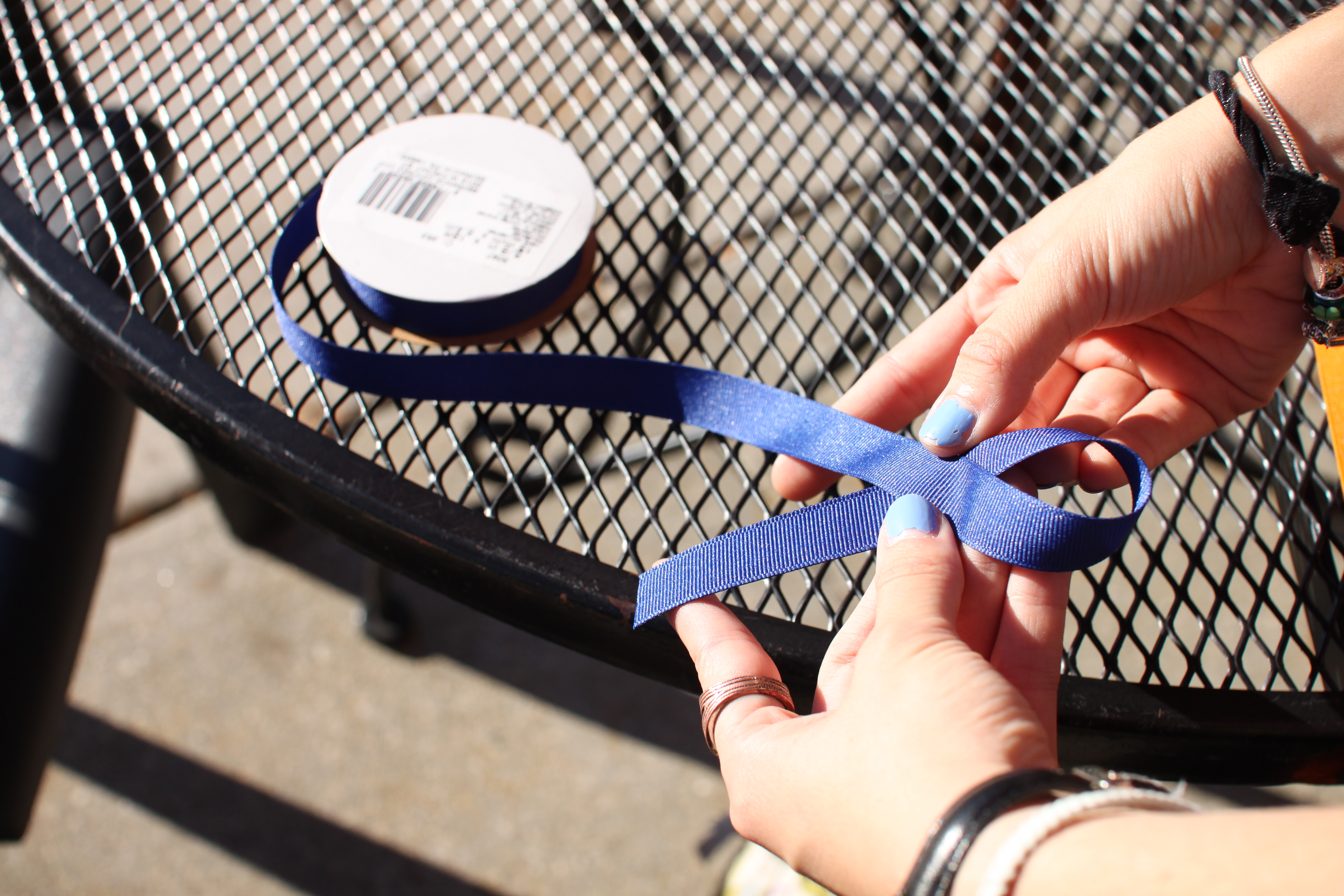 • Take a small piece of the smaller ribbon and tie a knot in the middle.