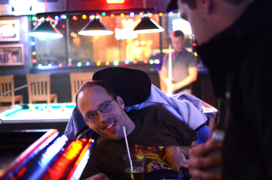 January 15, 2013 CMU Alumni, Featured Photo Story: Taking Chances Bryon Beutler is 32. He lives in Mount Pleasant, originally from Clarkston. In 2010, he graduated from Central Michigan University with a Bachelor’s Degree in News Editorial Journalism and a minor in Sports Studies. During his time at CMU, he wrote sports stories for Grand Central Magazine as well as Mount Pleasant Monthly (no longer in business). He enjoys playing on his iPhone 5, going to The Bird Bar & Grill, drinking Woodchuck and Rumchata, going to Detroit Tigers games and spending time with his friends. Bryon has also been skydiving and can float on his back in the water. Sounds like your average person, right? The unique thing about Bryon that sets him apart from the average person is that he has cerebral palsy; a disorder that impairs one’s control of their movement because of damage caused to the brain during development. Bryon was born three months premature and was diagnosed with cerebral palsy when he was 10 months old. But that never stopped him from living his life and achieving what some may believe to be impossible dreams for someone with his disability. Although he may need assistance from caregivers to complete daily tasks such as eating, bathing, getting in and out of bed, getting dressed and so on, Bryon is an extremely hard-willed individual with an amazing personality and a sense of humor that leaves you feeling like you had an intense abdominal workout just from laughing with him so much. Mount Pleasant resident Bryon Beutler, 32, drives his wheelchair out of the front door of his apartment on Tuesday, Dec. 4 and heads to his van for a trip to the grocery store. Bryon was diagnosed with cerebral palsy when he was 10 months old. Bryon checks the weather on his iPhone at his home on Thursday, Nov. 29. Because of the limited ability to use his hands, Bryon spends a lot of time playing on his phone because it is one of the activities he is able to easily do. Bryon wears a Central Michigan University class ring on his right hand. After starting school at CMU in 1999, he graduated with a Bachelor’s of Science in Journalism with a minor in Sports Studies in 2010. Hope, one of Bryon’s caregivers, feeds him soup for dinner on Thursday, Nov. 29. During a trip to Meijer on Thursday, Dec. 4 Bryon laughs while asking one of his caregivers to grab him a bottle of Rumchata from the liquor shelves. Bryon has his face shaved by his caregiver, Josh, on Tuesday, Dec. 11. Bryon jokes with Josh while hanging out at The Bird Bar & grill in downtown Mount Pleasant. The Bird is one of Bryon’s favorite bars to spend time at. After brushing his teeth, Bryon sucks water through a straw to swish around in his mouth then spits it out into a bowl held by his caregiver, Josh. Mount Pleasant resident Bryon Beutler receives help rolling onto his side from one of his caregivers, MacKensye, on Monday, Dec. 3. After being put into bed, MacKensye stretches Bryon’s arms, hands and legs to make sure the muscles are still having movement.