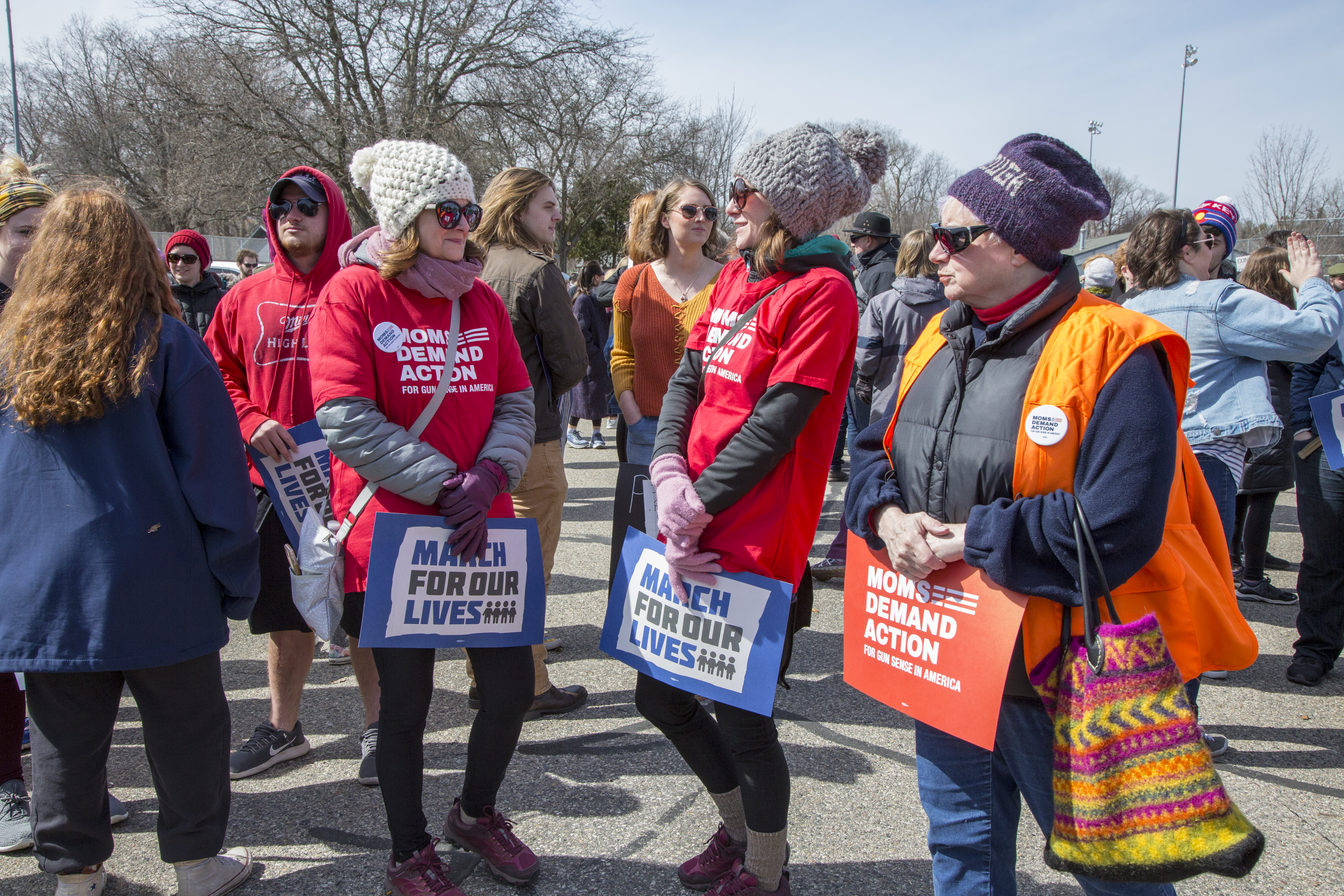 March 26, 2018 Campus Life, Events, Student Lifestyle, Students PHOTOS: The March For Our Lives Story by Clarissa Kell Photos by Xavier Mendoza Despite the cold and wind, there were around 700 people who showed up for the March For Our Lives event that took place in Mount Pleasant. From children in strollers to adults with walkers, a wide range of people with diverse backgrounds came to support the march that was organized by Central Michigan University students. March For Our Lives is a worldwide event that took place Saturday, March 24. In Mount Pleasant, the march began at 2 p.m. at Island Park then looped around to the Mount Pleasant City Hall building. Arrival for the march began at 1 p.m., where the organizers asked participants to sign a waiver to relinquish the fault if anything happened during the march. Tables were set up for Moms Demand Action, League of Women Voters and Promote the Vote. Mothers join the March For Our Lives event that started in Island Park and traveled around the city to city hall, Mt. Pleasant, MI on March 24, 2018. Moms Demand Action, or Moms Demand Action For Gun Sense in America, were handing out fliers about bills that are currently in legislation, like the Red Flag Law. The Red Flag Law is a policy that empowers family members and law enforcement to seek an Extreme Risk Protection Order— a court order temporarily restricting a person’s access to guns when they pose a danger to self or others. They were informing people in attendance of the march and then asking them to write postcards to their legislators about these bills. They were also giving out free signs to carry during the march, with some that said “Students Demand Action.” The League of Women Voters were helping participants register to vote if they weren’t already. Promote the Vote had a petition for participants to sign, a petition to amend the Michigan Constitution to create fair rules that remove barriers and make voting more secure. During the time waiting for the march to begin, the organizers reminded all of the participants about march etiquette, on how to act if counter protests showed up and to stay in the right lane on the streets the march took place. Mayor Allison Quast-Lents and Sara Spencer-Noggle, who is running for Isabella County probate judge, gave speeches showing their support before the march. During the march, chants rang out in Mount Pleasant for the town to hear— chants like, “no justice, no peace,” “NRA stop it, people over profit,” “never again” and “this is what democracy looks like.” There were many signs, held by varying ages of participants— signs that read, “It’s easier to buy guns than my education,” “Lock Down Guns, Not Kids,” “Jesus would be pissed” and “Invest in our kids, not the NRA.” James Shoup, who was attending the march in support of Dion Adams who is running for congress, said “I’m very proud of our young people here. I’m very proud to be here to support these kids. They’re accomplishing things we never did.” While participating in the march and chants, Shoup struck up conversations with those around him. He told those around him that weren’t chanting, “just your presence is loud enough.” J. Cherie Strachan, a Political Science and Public Administration professor, was also in attendance of the march with her family. Strachan said it is important to practice and hone in the skills of organizing these types of movements, which is why she runs the Democracy in Action project at CMU. Students enrolled in Political Science 105, Intro to American Government and Politics, participate in discussion groups and apply what they’re learning in the class to a current political issue facing our nation. This year was immigration, Strachan said next year it will be about guns. Strachan said the point of the project is to show students how they can create change and organize movements, just like this one. “It is hard work, but not impossible,” Strachan said. “It requires time and energy.” When marchers arrived at Mount Pleasant City Hall, they were directed to sit on a grassy hill next to the building to listen to more speeches. The people who spoke were Kali Fox – who was representing Debbie Stabenow, CMU history professor Mitchel K. Hall, Allan Riggs for Moms Demand Action, the president of League of Women Voters Lara Raisiaer and Father Wayne Nicholson from the St. Johns Episcopal Church. The consensus of all of the speeches made at the March For Our Lives event was best said by Lara Raisiaer, “Your vote is your voice.” An open forum, allowing participants to voice their own opinions, began after the speeches wrapped up.