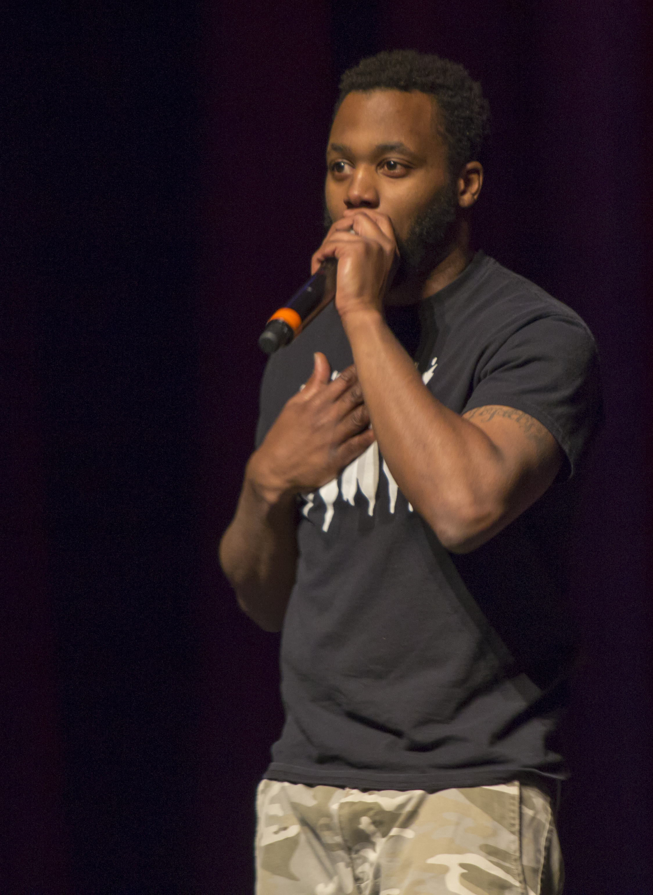 April 4, 2018 Arts & Entertainment, Arts & Entertainment, Events, Events, Music, Music, Pop Culture Recap: The Festival of Justus Story by Juliana Kampf Photos by Xavier Mendoza Students, families and friends gathered in Plachta Auditorium on Saturday, March 31 to attend the annual Festival of Justus. The festival is put on every year to showcase and celebrate the musical talents of Central Michigan University students and those a part of Justus League, a hip hop RSO. Moore Media Records, 101.1 The Beat, the Asian Cultural Organization and the NAACP were just some of the supporters at the festival. The show was hosted by Justus League member senior Daryl Wallace. He also performed some of his songs during the event. President of Justus League and DJ for 101.1 The Beat, Detroit senior Ahsha Davis took the stage as a spoken word poet along with alumnus Marceil Davis and Stevenson Altidor who also performed some of their poetry. The first musical act of the show was the local band Crystal Images. The band is made up of music students Orion Brill, Zachery Boyce and Tyler Runyan. They played four of their original songs, including one dedicated to Runyan’s high school friend Evan Gardner who had passed away. Their music was a folky, easy listening acoustic style. Next to walk onstage was Jim Bollella, the advisor for CMU’s radio station WMHW-FM. Bollella was asked to speak about what music means to him. “… It’s like asking a fish, ‘what does water mean to you?'” Bollella said. He spent most of his life working in radio stations and recording studios. Bollella believes that music is art and it deserves our undivided attention. “When I was a teenager our relationship to music was listening to music all by itself. You would clear your schedule, sit down and just listen to music… Music is everything to us,” Bollella said. Elliot Plummer took the stage with just his guitar in hand. Plummer only performed three songs, but even though his music was soft in style his lyrics were moving. Next up was the newest member of Justus League, Emmanuel Jacob. He had just released his first single that day. He sang three original songs, one of which he co-wrote with Wallace, and performed a rendition of “Purple Rain,” originally performed by the late Prince. All of Jacob’s songs were made of soulful R&B lyrics and powerful vocals accompanied by a piano. Wallace performed some of his original songs as D. Anonymous and also performed a new song from his future album with the help of singer Megan Eurton-Henderson. Then the one-man band Walk Her Arms came to the stage. This band was founded by Ian Armstrong whose vocals were deep and powerful. He was found by Justus League in the old coffee shop The Dreamer. Armstrong performed three original songs. Car Crash Rhetoric came on after Armstrong and at first they experienced some technical difficulties, but they got their set rolling quickly. The pop punk band performed four original songs. The band included guitarist Kyle Engel, drummer Jacob Seavey, and bass player Jeremy Wattie. Each of them is a CMU student. Justus League vet Snafu, otherwise known as Ayinde Pulliam, performed one of his songs before Muskegon senior Tim Crosby, otherwise known as Top Notch, took the stage. Top Notch performed a couple of his more well known songs for the event finale. Atendance was low for this year’s Festival of Justus, but that didn’t stop its performers from putting on show after show.