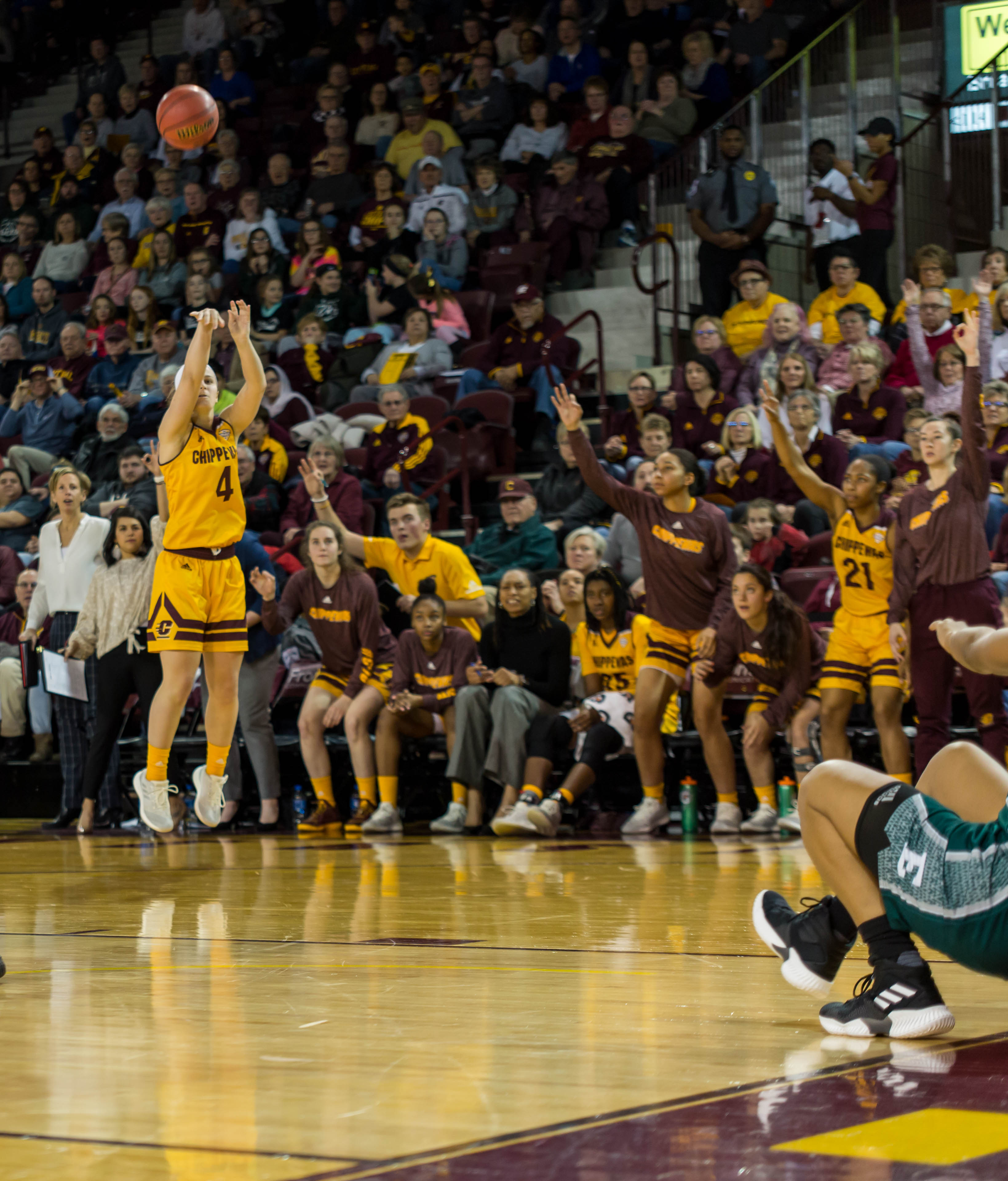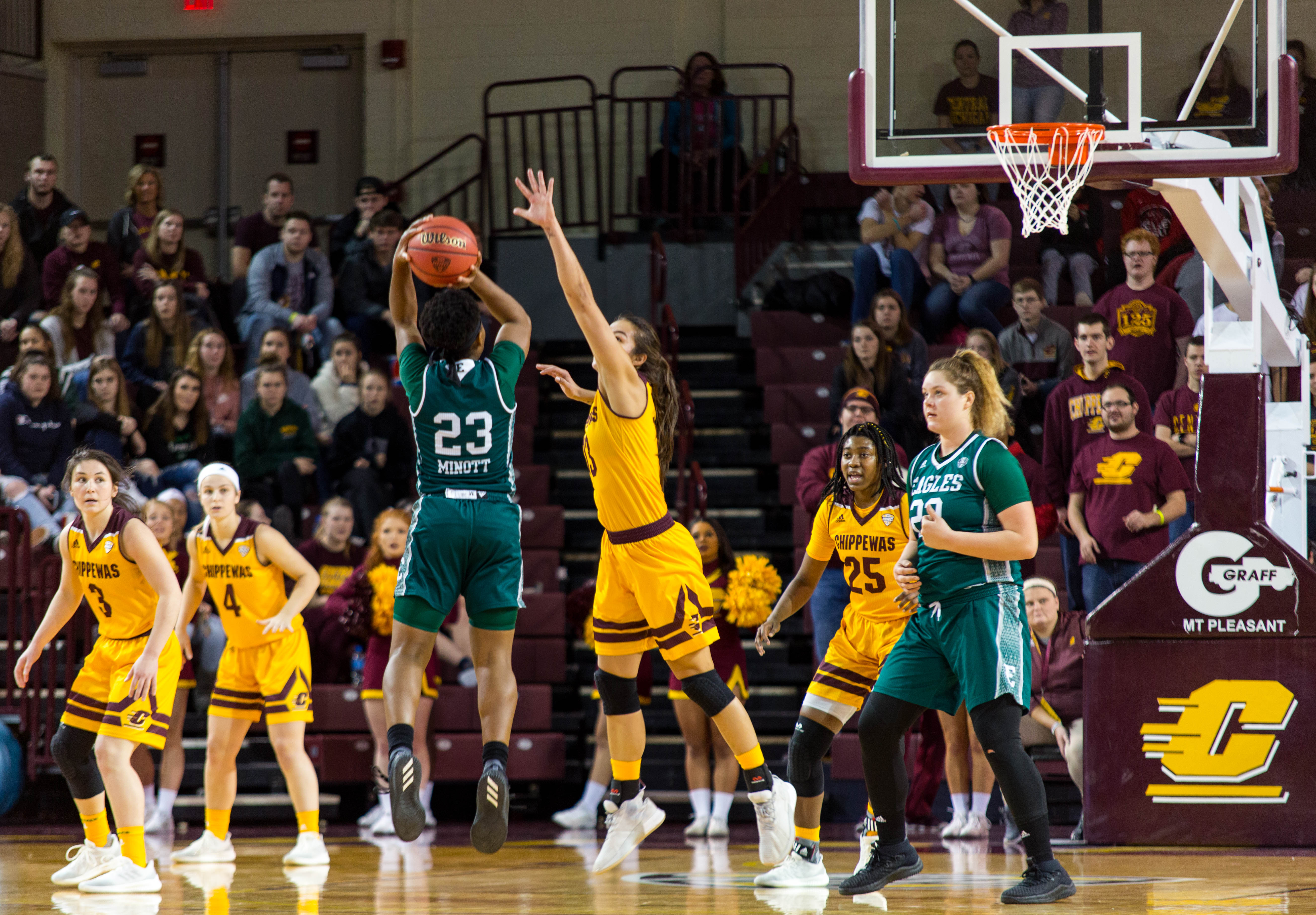 January 28, 2019 Events, Photo Gallery, Sports, Students Record broken for the Women’s Basketball team Photos by Xavier Mendoza McGuirk Arena exploded in cheers as Wayland senior Presley Hudson breaks the Women’s Basketball all-time scoring record. Hudson became the program’s leading scorer with 30 seconds left in the first quarter passing over 2,000 career points. The Women’s team beat the Eastern Michigan Eagles 71 – 61. Their next home game will be against the Buffalo Bulls on Feb. 2. Senior guard Presley Hudson (3) shoots a three with EMU guard Jenna Annecchiarico (13) closely defending her during the Eastern Michigan Eagles on Jan. 26, 2018. The Chippewas win the game 71-61. Senior center Reyna Frost (13) puts defensive pressure on EMU guard Danielle Minott (23) against the Eastern Michigan Eagles on Jan. 26, 2018. The Chippewas win the game 71-61. Sophomore guard Maddy Watters (4) attempts a three during the third quarter against the Eastern Michigan Eagles on Jan. 26, 2018. The Chippewas win the game 71-61. Senior center Reyna Frost (13) gets a lay up against the Eastern Michigan Eagles on Jan. 26, 2018. The Chippewas win the game 71-61. Sophomore guard Micaela Kelly (1) drives to the basket against the Eastern Michigan Eagles on Jan. 26, 2018. The Chippewas win the game 71-61. Senior center Reyna Frost (13) battles for the ball against the Eastern Michigan Eagles on Jan. 26, 2018. The Chippewas win the game 71-61. Sophomore guard Micaela Kelly (1) finishes a tough lay up against the Eastern Michigan Eagles on Jan. 26, 2018. The Chippewas win the game 71-61. The team gets into a huddle at the end of the timeout against the Eastern Michigan Eagles on Jan. 26, 2018. The Chippewas win the game 71-61. Senior guard Presley Hudson (3) starts her motion to drive to the basket against the Eastern Michigan Eagles on Jan. 26, 2018. The Chippewas win the game 71-61. Senior center Reyna Frost (13) communicates with her team right before she shoots her free throws against the Eastern Michigan Eagles on Jan. 26, 2018. The Chippewas win the game 71-61. Senior guard Presley Hudson (3) takes a hard foul against the Eastern Michigan Eagles on Jan. 26, 2018. The Chippewas win the game 71-61. The team cheers on their fellow Chippewas during a field goal made against the Eastern Michigan Eagles on Jan. 26, 2018. The Chippewas win the game 71-61.