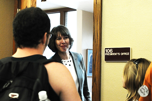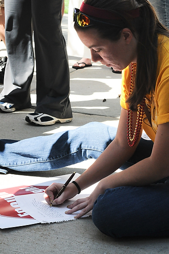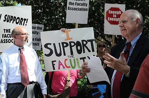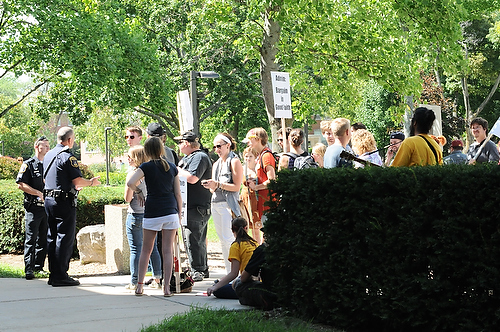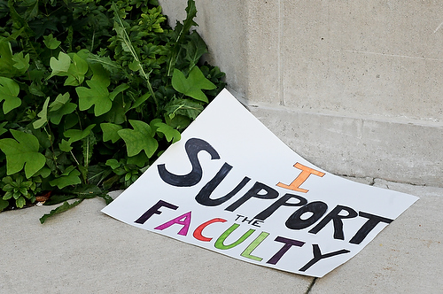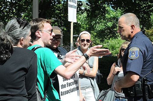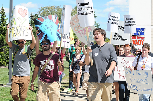 August 22, 2011 Featured, Students Students show support for CMU Faculty Association Central Michigan University students in support of the faculty association march on campus Monday afternoon. Tanya Moutzalias | Co-Visuals Editor The Central Michigan University Faculty Association announced a work stoppage for Monday, August 22, 2011. While many part-time faculty members were still contractually obligated to hold classes, many CMU students protested alongside faculty. As of the publication of this article and photo gallery, Judge Paul Chamberlain has ordered all CMU Faculty back into the classroom to resume teaching. The order comes at the request of the administration, and the faculty said they will adhere to it. Before the court order was issued, faculty members and students engaged in picket lines and protests throughout CMU’s campus. Central Michigan University students in support of the faculty association march on campus Monday afternoon. Tanya Moutzalias | Co-Visuals Editor Central Michigan University students show their support for the faculty association during the FA’s strike Monday, when classes were supposed to begin. Tanya Moutzalias | Co-Visuals Editor Central Michigan University students in support of the faculty association’s strike are held back by campus police from the doors to the Warriner Hall, Monday afternoon. Tanya Moutzalias | Co-Visuals Editor CMU Highland senior, Katherine Horace, writes a letter to President Ross outside of Warriner Hall Monday afternoon. Tanya Moutzalias | Co-Visuals Editor CMU senior, Tom Jackson, Waterford, talks with campus police Officer A. McArthur outside of Warriner Hall with other student picketers whom are in support of the faculty association, Monday afternoon. Tanya Moutzalias | Co-Visuals Editor CMU students in support of the faculty assocation, take their march to President Ross’s office. Students were told he was not in his Warriner Hall office and currently unavailable, Monday afternoon. Tanya Moutzalias | Co-Visuals Editor