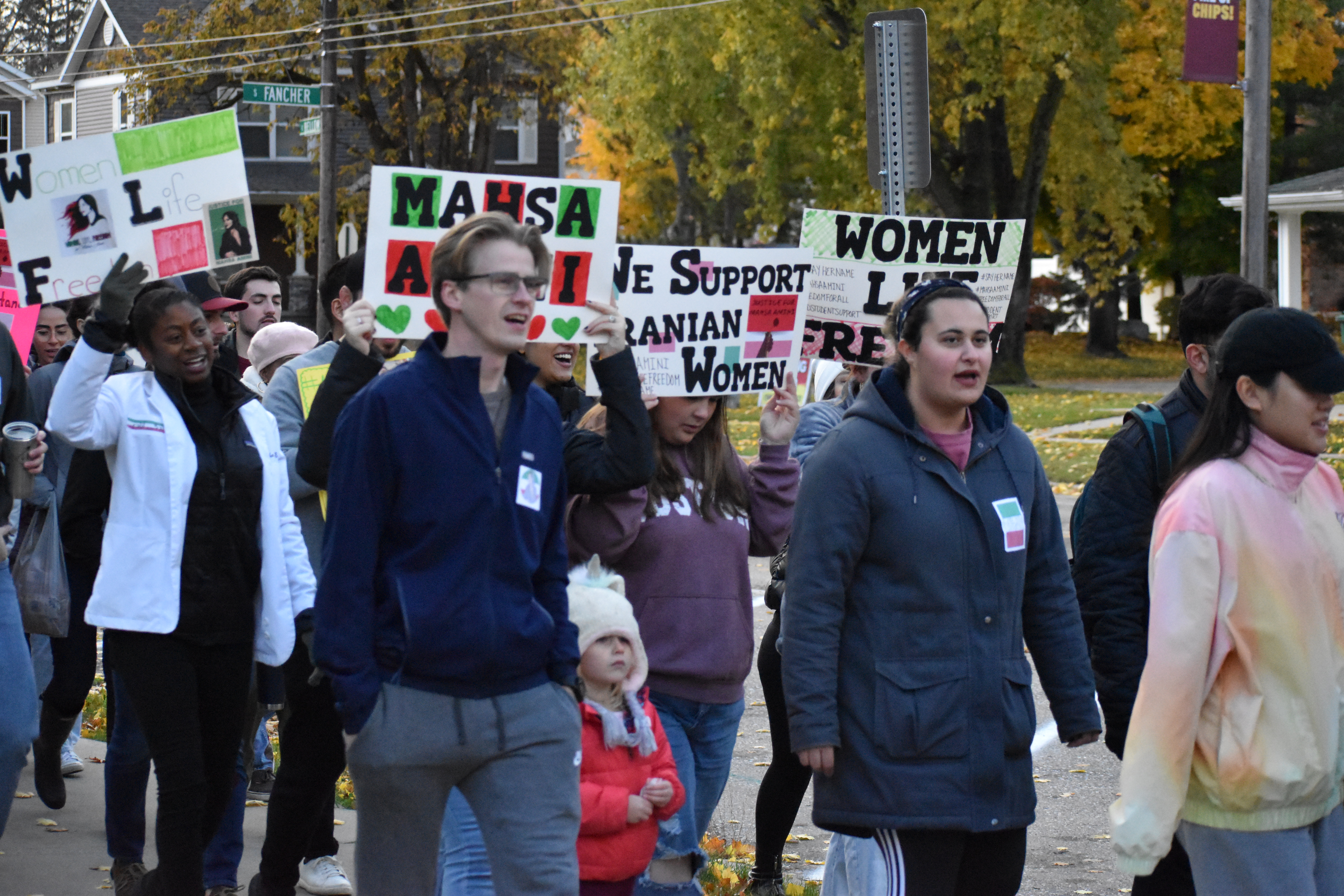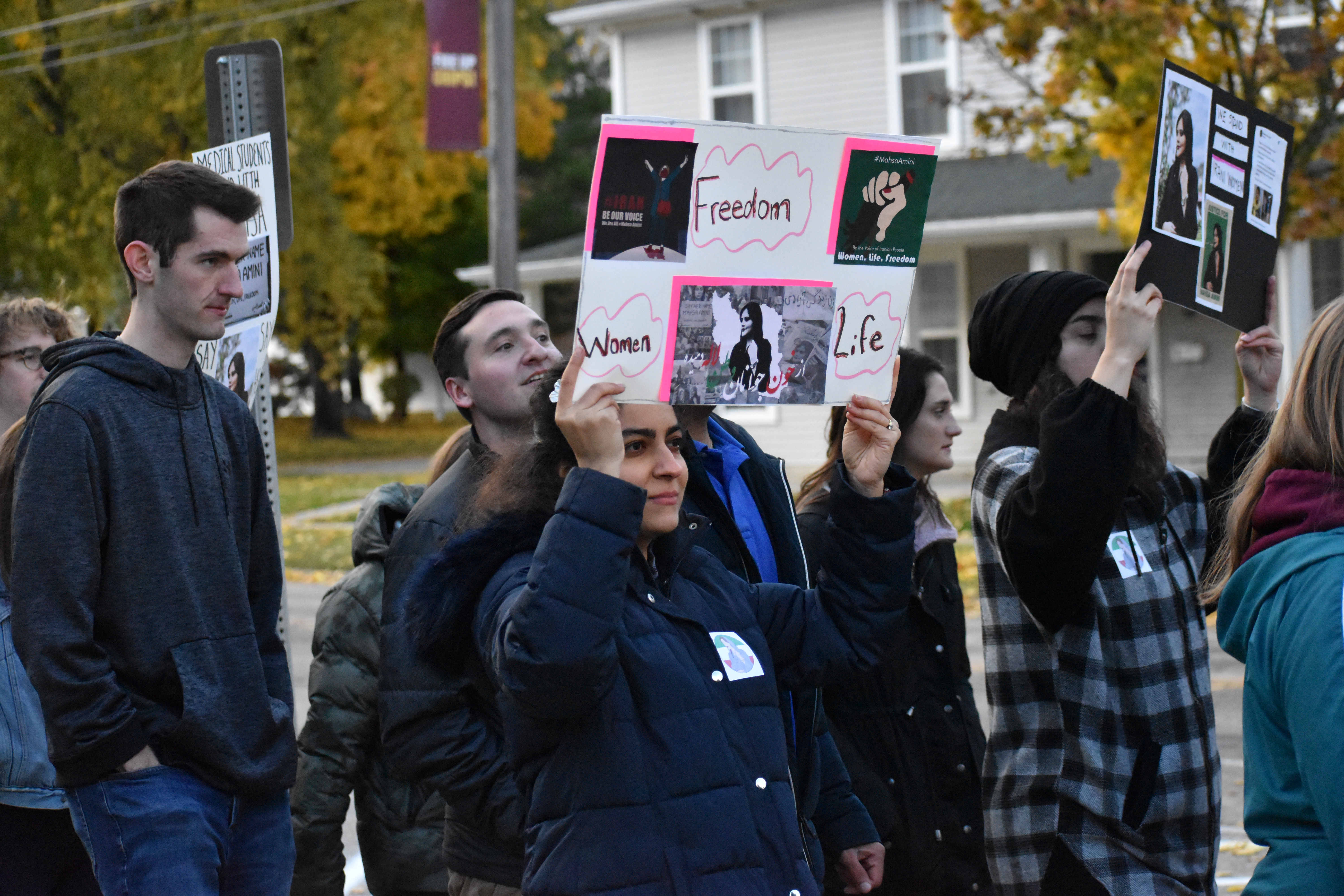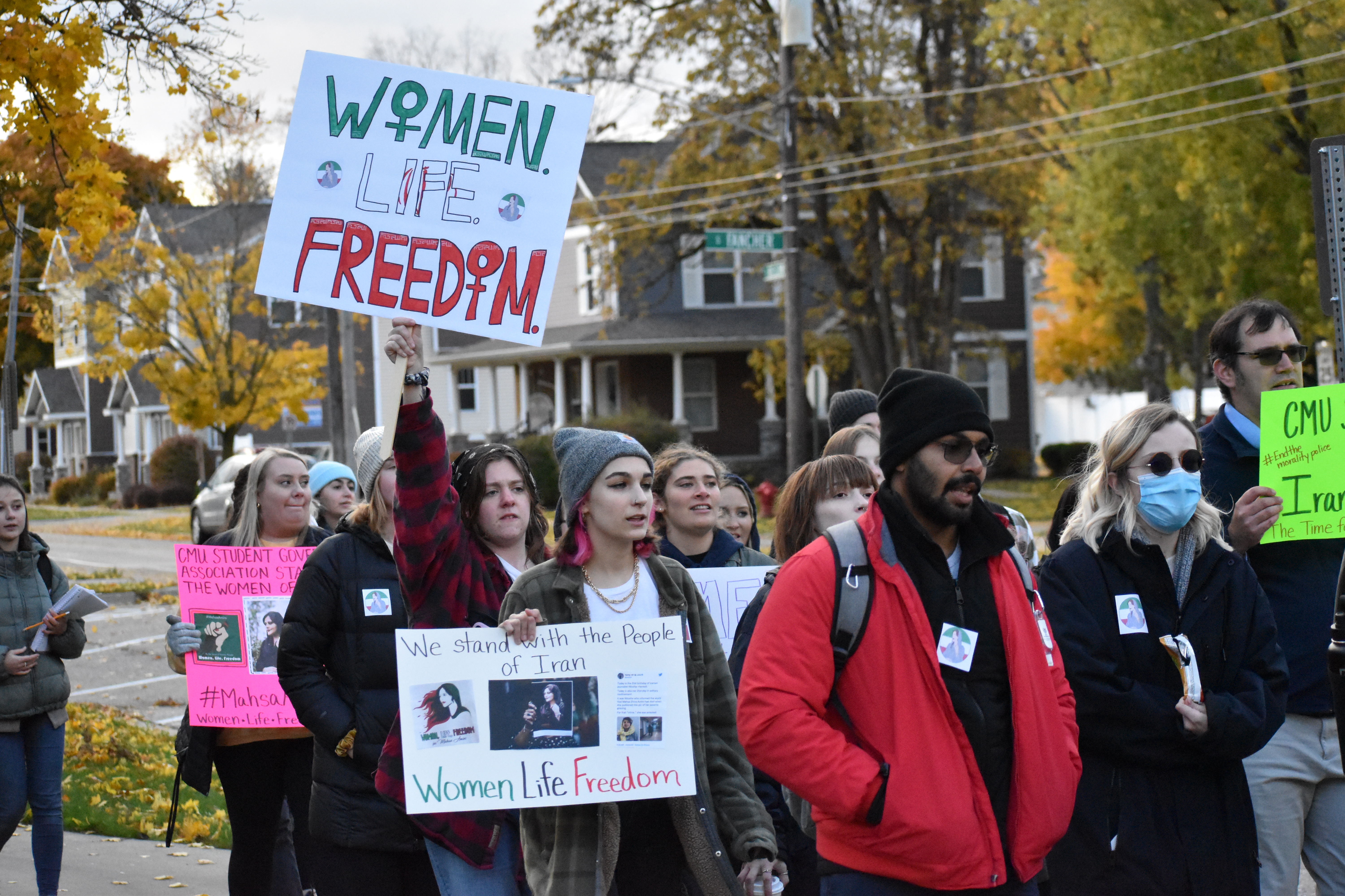 October 27, 2022 Student Lifestyle Women, Life, Freedom: the fight for bodily autonomy in Iran and remembering Mahsa Amini Story by: Isabella Trujillo and Maddie Lajewski Photos by: Maddie Lajewski “Zan, Zendegi, Azadi” and “Women, Life, Freedom.” Those were the words chanted by students, staff and alumni on Wednesday night, as they marched on campus and Mission Street demanding justice for the death of Mahsa Amini. Amini was a 22-year-old Iranian woman who died in police custody in Tehran, Iran on Sept. 16, 2022. She was arrested by the Guidance Patrol for “not wearing her hijab within government standards.” Following the 1979 revolution, the hijab has been statutory for Iranian women. Amini’s death sparked protests across the world, condemning the actions of the Guidance Patrol, the morality police and the Iranian government. As they marched, participants held signs that said, “justice for Mahsa Amini,” “we support Iranian women,” and “the time for change is now.” Dozens of participants march down Mission St., as passing cars honk their horns in solidarity. The CMU event was organized by Kiara Timmerman, chair of the Student Diversity Committee at the College of Medicine and Arya Tavakoulnia. “I worked with Arya and the rest of the committee for about a month now getting this march organized together,” Timmerman said. “We really wanted the students to be a big part of it, to bridge the medical school with the undergraduate campus and the other graduate programs, to all come together for this really important cause. “We want everyone to realize that students care, that women’s rights are extremely important, and as busy as we are, there’s always time to take time to appreciate the rights that we do have and to fight for those who don’t have as many rights as we do that should have those rights.” Undergraduate, graduate and medical students prepared to march and demand justice for Amini, in addition to faculty, staff and alumni. Arya Tavakoulnia hypes up participants, and teaches them the chants “women, life, freedom” and “zan, zendegi, azadi.” “I knew nothing about what was going on, but I looked forward to it,” said undergraduate student Allison Strnav. “I feel like we should fight for everyone’s rights everywhere, not just in America. This is really important for women.” Adrianna Gillis, an undergraduate student, and Jessa Heroux-Croy, a graduate student, shared their thoughts on this event and why they made the decision to attend. “The ability to feel like I am doing something rather than sitting on the sidelines,” said Gillis. “Even if it’s just awareness raising, the ability to bring media attention to this issue that has been so closed off, and the nation that it’s coming from obviously is my giant motivator.” Signs prepared and provided by students for participants to use during the march. “It’s not every day that the CMU community is able to come together and do something like this,” said Heroux-Croy. “So, every time there’s an opportunity and I see it, I try to bring as many people as I can and just participate.” Taylor Idema, the Student Government Association President also attended the event with fellow SGA members, in support of the march. “We’re hoping that it will bring awareness,” said Idema. “This is not just a CMU campus movement. Today has been 40 days since she was killed and there are movements all over the country happening today. So, I think it’s just cool to be a part of something bigger than just here.” Taylor (left) and Judy Idema pose for a photo with their signs calling for justice for Mahsa Amini before the march. In Iran, there is a tradition that on the 40th day after a person’s death, their life should be celebrated by the people who have mourned them. Oct. 26 marked the 40th day of Amini’s death. While the event garnered support from SGA and other various participants, President Robert Davies attended for himself and to represent the university as a whole. “This is a grassroots effort by our students,” Davies said. “It started with our medical school students, then our excellent student leaders, the Student Government Association, jumped on. This is their way of being civically engaged, showing the importance and support for education, and also understanding that education is not accessible for many individuals. How education is an amazing tool to uplift communities.” With Iranian security forces continuing to use excessive force on protesters within the country and the Iranian government blocking internet access to parts of Iran, Timmerman emphasized the importance of this movement and what CMU can do to give support. “We want everybody to share this as much as humanly possible,” said Timmerman. “We want this out on social media, we want this out on the web pages, in the student newspapers, pretty much everywhere. The more awareness we can bring, the more help we can send to the women who are fighting in Iran right now and make sure their voices are heard and that they know their voices are being heard across the entire world.” A participant visits with others while preparing for the march.Participants begin the march by loudly chanting in front of Warriner Hall on Central Michigan’s campus.A participant holds a sign and chants while marching.People of all different ages and backgrounds join together to march for Mahsa Amini and change in Iranian hijab laws.Participants begin to leave campus and transition to Mission St., in order to reach a larger audience.A participant marches in the protest while holding a sign, and chanting for justice and change.A participant confidently holds a sign high stating “women, life, freedom,” and demanding justice and change.