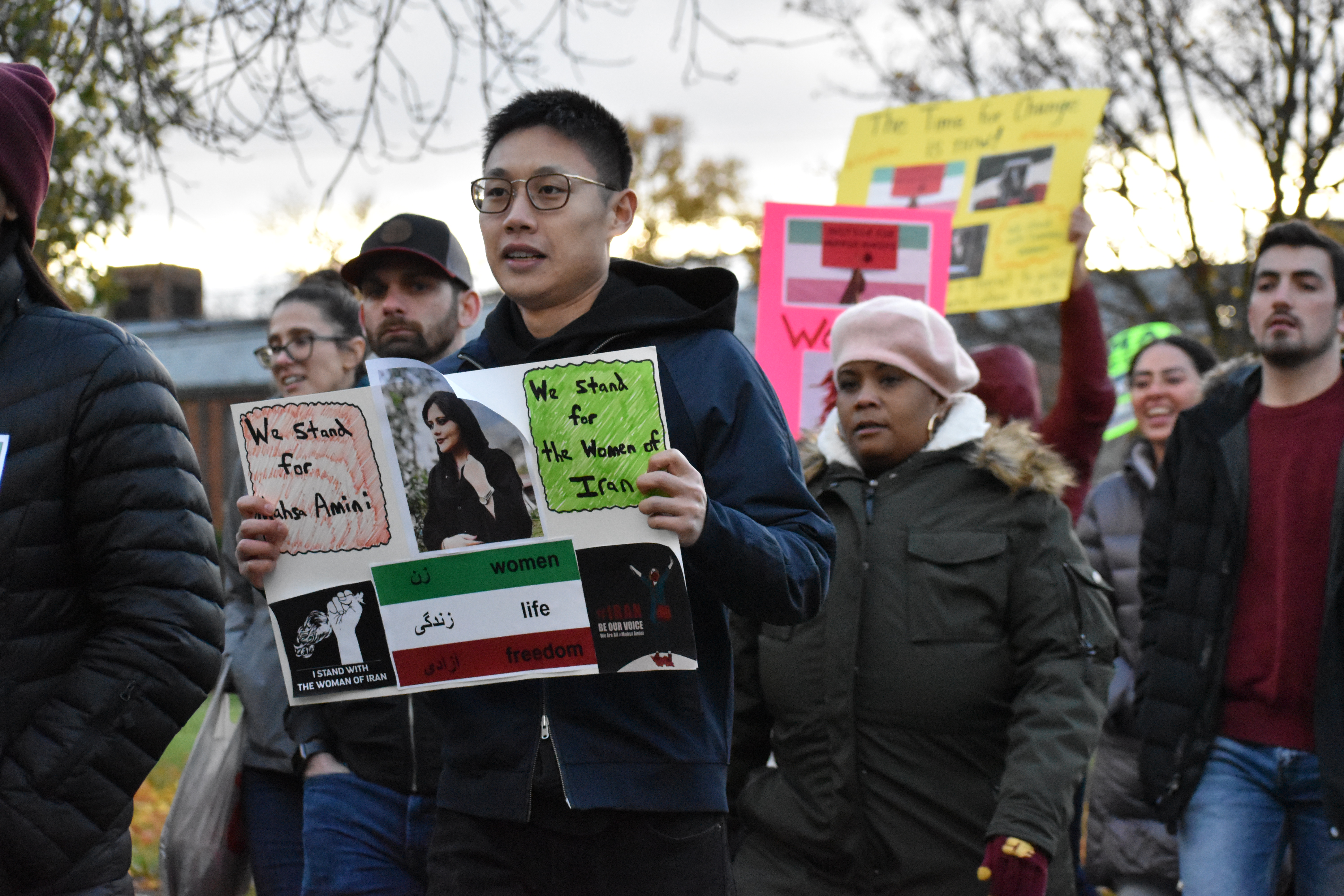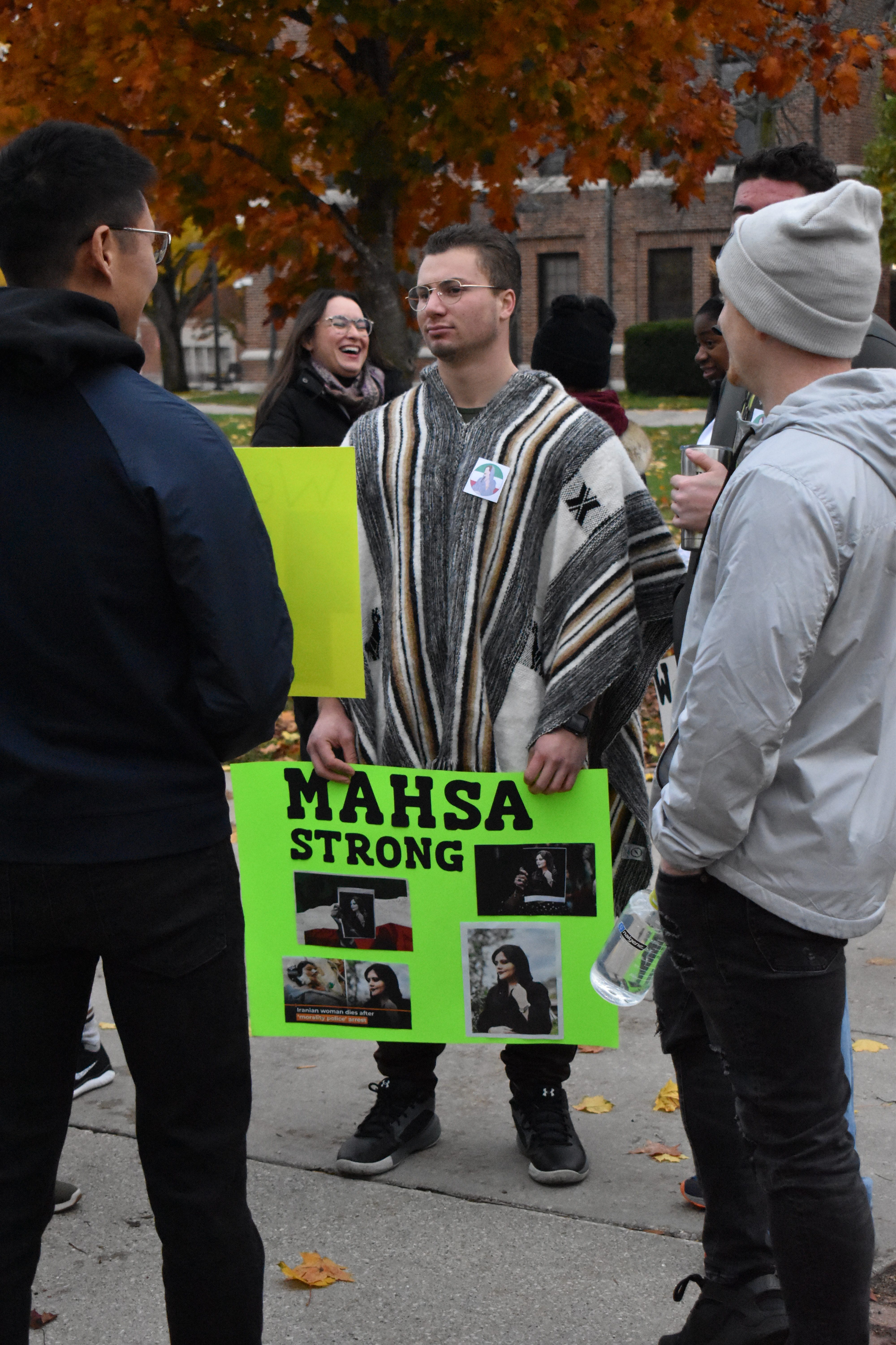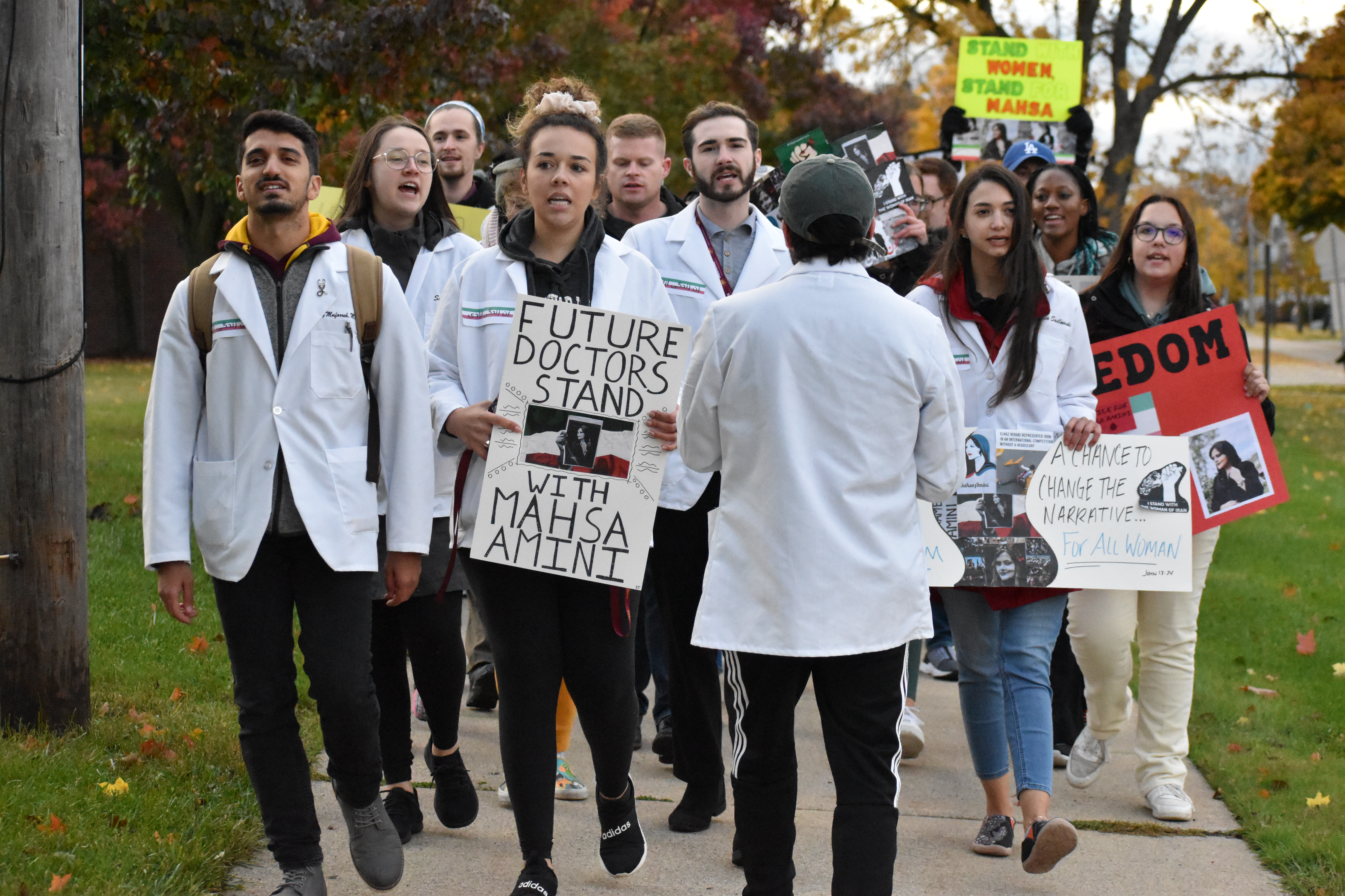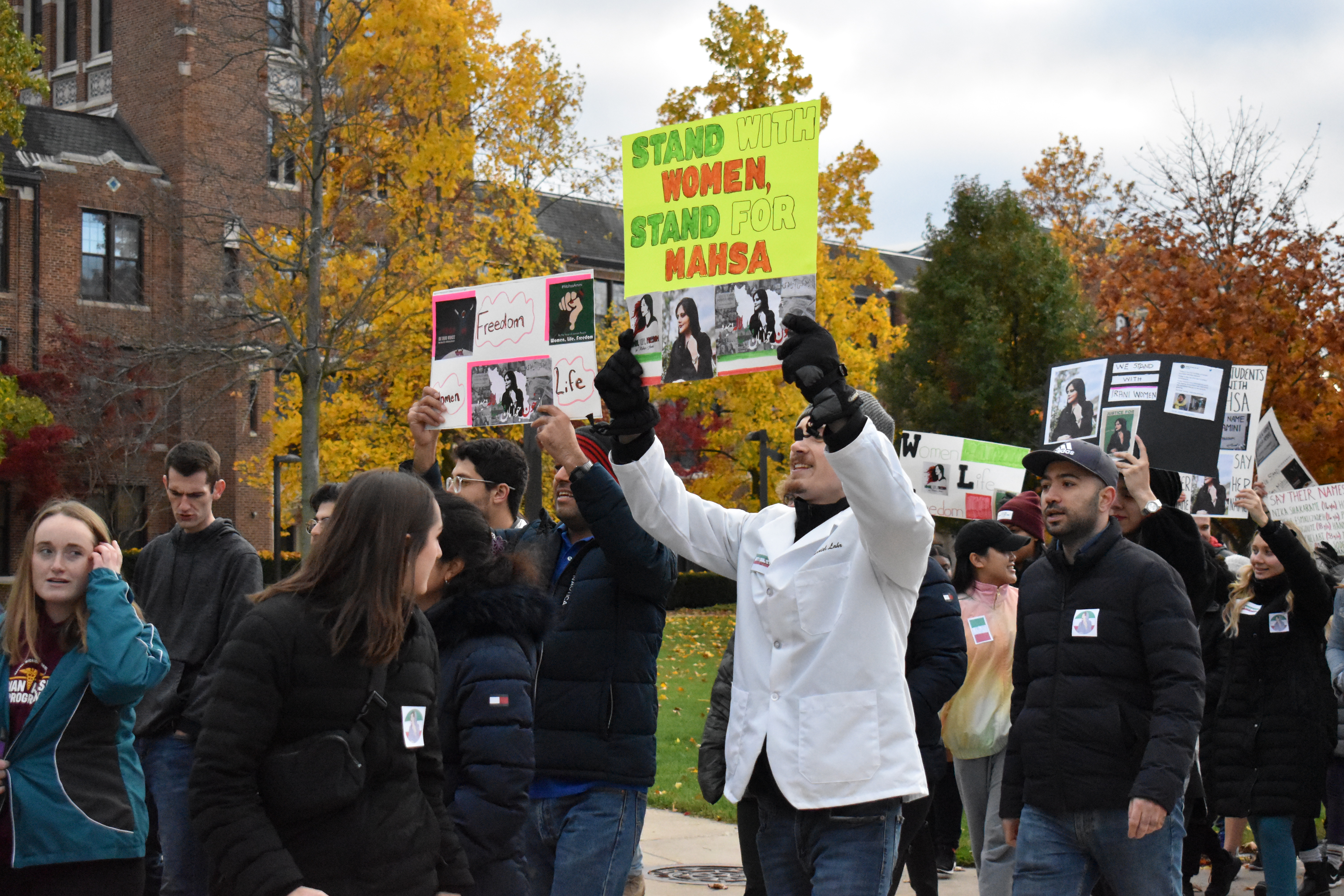 October 27, 2022 Student Lifestyle Women, Life, Freedom: the fight for bodily autonomy in Iran and remembering Mahsa Amini Story by: Isabella Trujillo and Maddie Lajewski Photos by: Maddie Lajewski “Zan, Zendegi, Azadi” and “Women, Life, Freedom.” Those were the words chanted by students, staff and alumni on Wednesday night, as they marched on campus and Mission Street demanding justice for the death of Mahsa Amini. Amini was a 22-year-old Iranian woman who died in police custody in Tehran, Iran on Sept. 16, 2022. She was arrested by the Guidance Patrol for “not wearing her hijab within government standards.” Following the 1979 revolution, the hijab has been statutory for Iranian women. Amini’s death sparked protests across the world, condemning the actions of the Guidance Patrol, the morality police and the Iranian government. As they marched, participants held signs that said, “justice for Mahsa Amini,” “we support Iranian women,” and “the time for change is now.” Dozens of participants march down Mission St., as passing cars honk their horns in solidarity. The CMU event was organized by Kiara Timmerman, chair of the Student Diversity Committee at the College of Medicine and Arya Tavakoulnia. “I worked with Arya and the rest of the committee for about a month now getting this march organized together,” Timmerman said. “We really wanted the students to be a big part of it, to bridge the medical school with the undergraduate campus and the other graduate programs, to all come together for this really important cause. “We want everyone to realize that students care, that women’s rights are extremely important, and as busy as we are, there’s always time to take time to appreciate the rights that we do have and to fight for those who don’t have as many rights as we do that should have those rights.” Undergraduate, graduate and medical students prepared to march and demand justice for Amini, in addition to faculty, staff and alumni. Arya Tavakoulnia hypes up participants, and teaches them the chants “women, life, freedom” and “zan, zendegi, azadi.” “I knew nothing about what was going on, but I looked forward to it,” said undergraduate student Allison Strnav. “I feel like we should fight for everyone’s rights everywhere, not just in America. This is really important for women.” Adrianna Gillis, an undergraduate student, and Jessa Heroux-Croy, a graduate student, shared their thoughts on this event and why they made the decision to attend. “The ability to feel like I am doing something rather than sitting on the sidelines,” said Gillis. “Even if it’s just awareness raising, the ability to bring media attention to this issue that has been so closed off, and the nation that it’s coming from obviously is my giant motivator.” Signs prepared and provided by students for participants to use during the march. “It’s not every day that the CMU community is able to come together and do something like this,” said Heroux-Croy. “So, every time there’s an opportunity and I see it, I try to bring as many people as I can and just participate.” Taylor Idema, the Student Government Association President also attended the event with fellow SGA members, in support of the march. “We’re hoping that it will bring awareness,” said Idema. “This is not just a CMU campus movement. Today has been 40 days since she was killed and there are movements all over the country happening today. So, I think it’s just cool to be a part of something bigger than just here.” Taylor (left) and Judy Idema pose for a photo with their signs calling for justice for Mahsa Amini before the march. In Iran, there is a tradition that on the 40th day after a person’s death, their life should be celebrated by the people who have mourned them. Oct. 26 marked the 40th day of Amini’s death. While the event garnered support from SGA and other various participants, President Robert Davies attended for himself and to represent the university as a whole. “This is a grassroots effort by our students,” Davies said. “It started with our medical school students, then our excellent student leaders, the Student Government Association, jumped on. This is their way of being civically engaged, showing the importance and support for education, and also understanding that education is not accessible for many individuals. How education is an amazing tool to uplift communities.” With Iranian security forces continuing to use excessive force on protesters within the country and the Iranian government blocking internet access to parts of Iran, Timmerman emphasized the importance of this movement and what CMU can do to give support. “We want everybody to share this as much as humanly possible,” said Timmerman. “We want this out on social media, we want this out on the web pages, in the student newspapers, pretty much everywhere. The more awareness we can bring, the more help we can send to the women who are fighting in Iran right now and make sure their voices are heard and that they know their voices are being heard across the entire world.” A participant visits with others while preparing for the march.Participants begin the march by loudly chanting in front of Warriner Hall on Central Michigan’s campus.A participant holds a sign and chants while marching.People of all different ages and backgrounds join together to march for Mahsa Amini and change in Iranian hijab laws.Participants begin to leave campus and transition to Mission St., in order to reach a larger audience.A participant marches in the protest while holding a sign, and chanting for justice and change.A participant confidently holds a sign high stating “women, life, freedom,” and demanding justice and change.